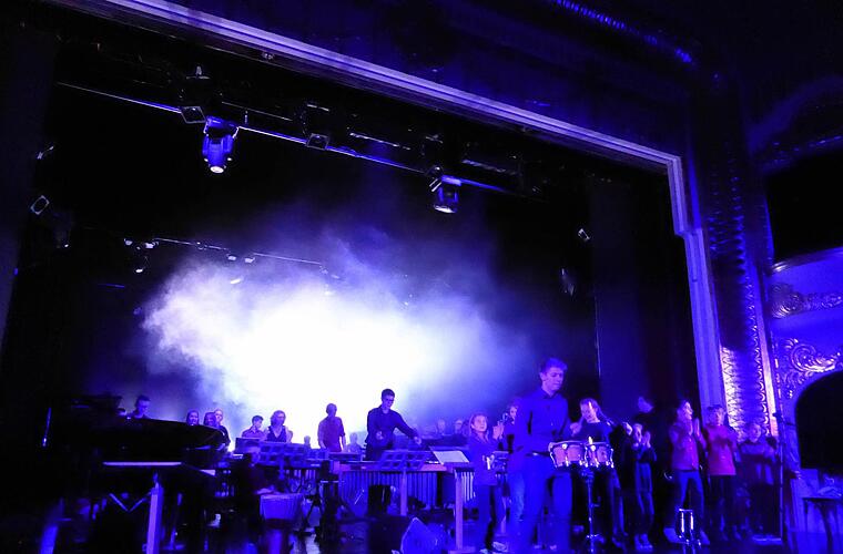 Die Jüngsten stellten sich auf drei Marimbaphonen mit Duke Ellingtons "C-Jam Blues" vor, durften aber immer wieder auch im großen Ensemble mitspielen, etwa auf der Cajón oder mit Handtrommeln, und fühlten sich sichtbar wohl auf der Bühne bei diesem sehr abwechslungsreichen Programm.