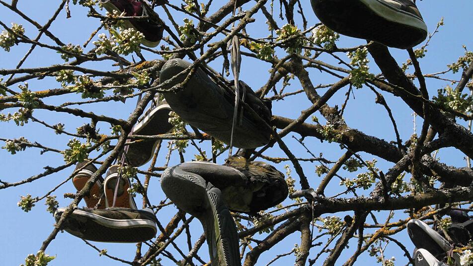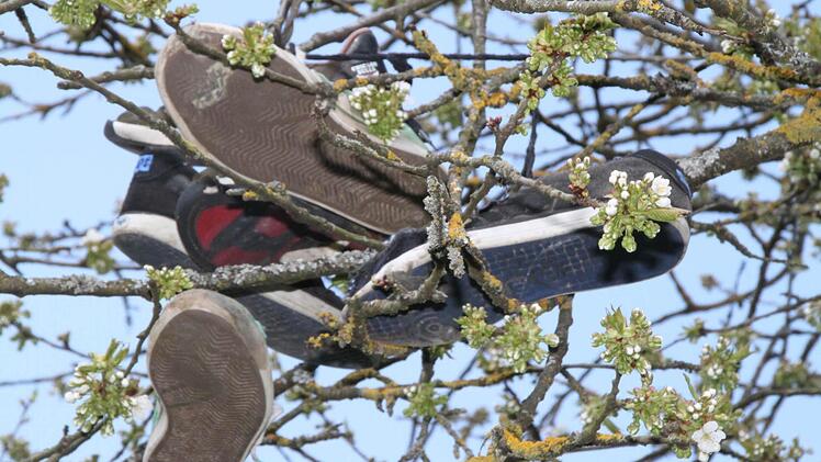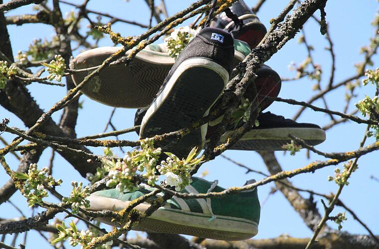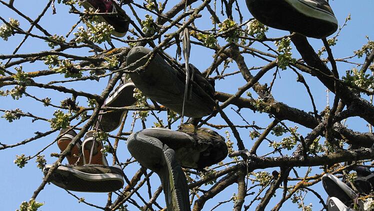 Seit mehreren Jahren schon hängen die ältesten Exemplare im Baum. Man sieht es an den traurig herabhängenden Sohlen oder wachsenden Löchern.