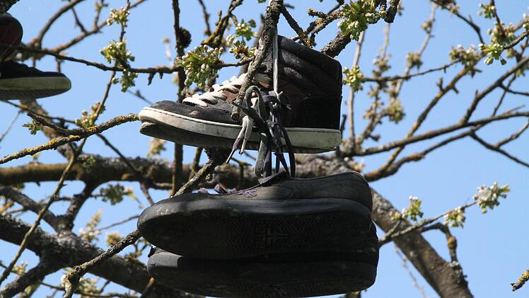 Abgelatschte Turnschuhe irgendwie sichtbar zu entsorgen, ist bei Skatern nichts ungewöhnliches, weiß das Münnerstädter Skater-Quartett. Aus Schweinfurt wissen sie, dass die Schuhe dort an einem Rohr befestigt werden.