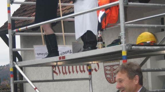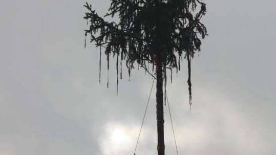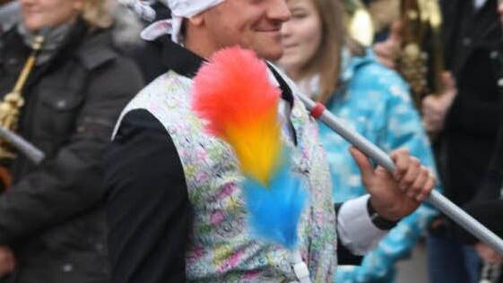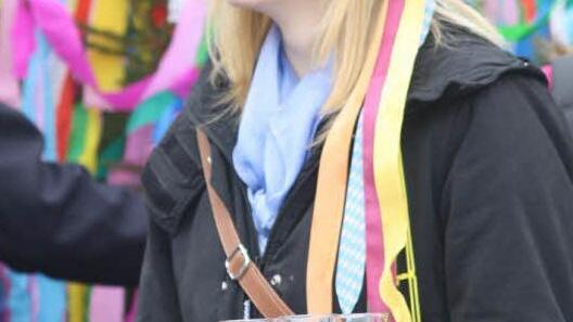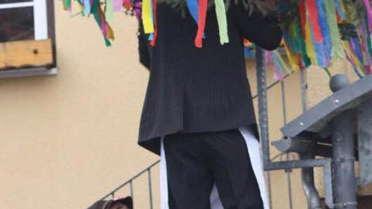 Patrick Hereth als "Putzfrau" unterwegs Weiter ging's zum Rathaus, wo der zweite Baum aufgesteckt wurde. Dort hielt Nico Böhm seine Rede vom Baugerüst aus - assistiert von Hendrik Kenner, der auch schon Lena tatkräftig unterstützte. Für heitere Stimmung beim Publikum sorgte Patrick Hereth durch seine fan tasievollen Verkleidungen. Mit Staubwedel und Wischmopp bewaffnet, bahnte er sich seinen Weg durch die Menge.