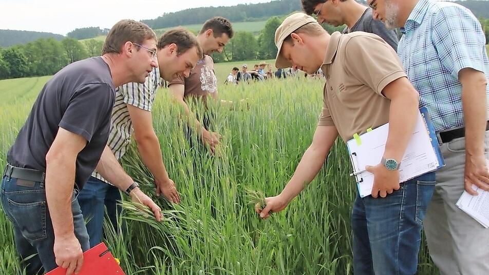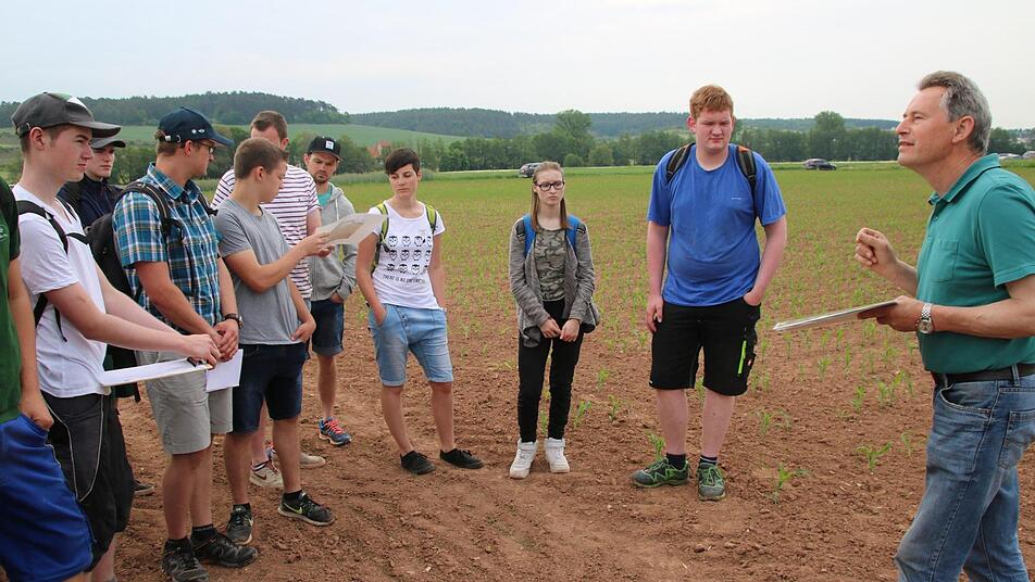 Jochen Then zeigt einen Mais-Versuchsacker. Bevor der Mais dort ausgesät wurde, hatte der Burglaurer Landwirt verschiedene Zwischenfrüchte wachsen lassen. So wird demonstriert, wie Zwischenfrüchte Bodenerosion verhindern können und die Stickstoffverteilung im Boden günstig beeinflussen. Die ersten, die bereits eine Führung durch die Schauflächen erhalten haben, sind Schüler des Berufsgrundschuljahres in Schweinfurt. Die anwesenden Fachleute erläuterten auch die Versuche mit verschiedenen Getreidesorten.