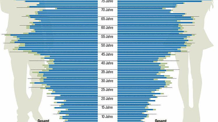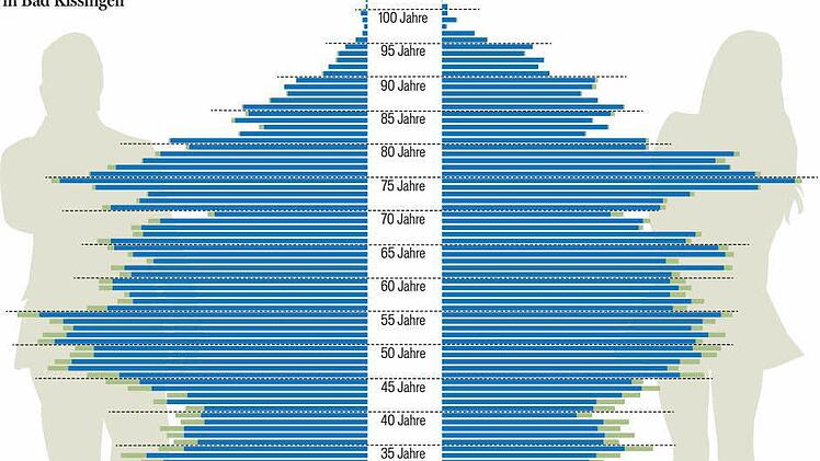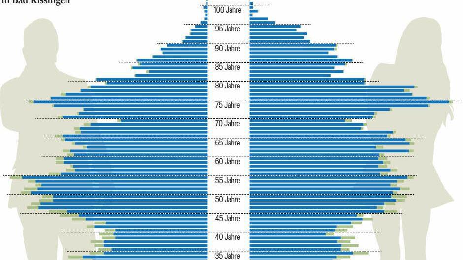 Alterspyramide Früher nahm die Zahl der Männer und Frauen statistisch in jedem Lebensjahr ab, die grafische Darstellung der Einwohnerzahlen nach Jahrgängen (rechts) heißt deshalb auch heute noch Alterspyramide. Der "Pillenknick" und stetig sinkende Geburtenzahlen haben aus der früheren Pyramide eher einen "Pilz" gemacht: So feiern ihren 1. Geburtstag heuer nur 161 Kinder in Bad Kissingen, der größte Jahrgang mit 186 Männern und 254 Frauen ist der Jahrgang 1940. Zwischen 1936 und 1969 liegen nur fünf Jahrgänge unter 300 Einwohnern.
