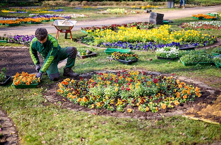 Ungeduldig stehen über 40.000 Frühjahrsblumen in den Gewächshäusern der Bamberger Stadtgärtnerei und warten darauf, dass sie von den Stadtgärtnern in die vielen Blumenbeete in der Stadt gepflanzt werden. Darunter neben den klassischen Stiefmütterchen und Gänseblümchen bewusst viele besonders bienenfreundliche Arten wie Goldlack und Vergissmeinnicht.