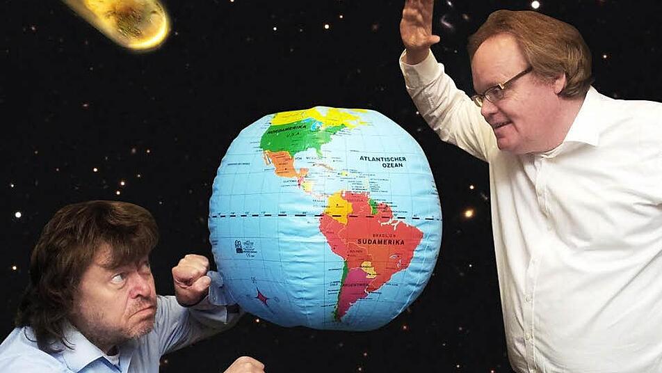 Ein Grund, zu verzweifeln? Nein, meinen Böhm und Bach, die sich dementsprechend Gedanken zur längerfristigen Rettung des Erdenbürgers machten. "Wir lassen keinen im Asteroidenhagel stehen", brachte es der Akkordeonspieler auf den Punkt. Natürlich sollen ab Aschermittwoch neben dem Duo noch viele andere zu Wort kommen, die sich der Thematik mit dem geboten Engagement widmeten: "Götter, Sänger, Lyriker, Existenzgründer, Feinschmecker und natürlich ebenso die schweigende Mehrheit", so die Künstler, die es bei der Recherche faszinierte, "mit welcher Leidenschaft sich mancher Erdenbewohner den Untergang schon ausmalte". Alles zu erleben in "5 nach 12" am 13. und 14. Februar und dann vielleicht auch noch am 16. Februar - sofern uns der nahende 50 Meter große Asteroid am Tag zuvor nicht doch noch erwischt.
