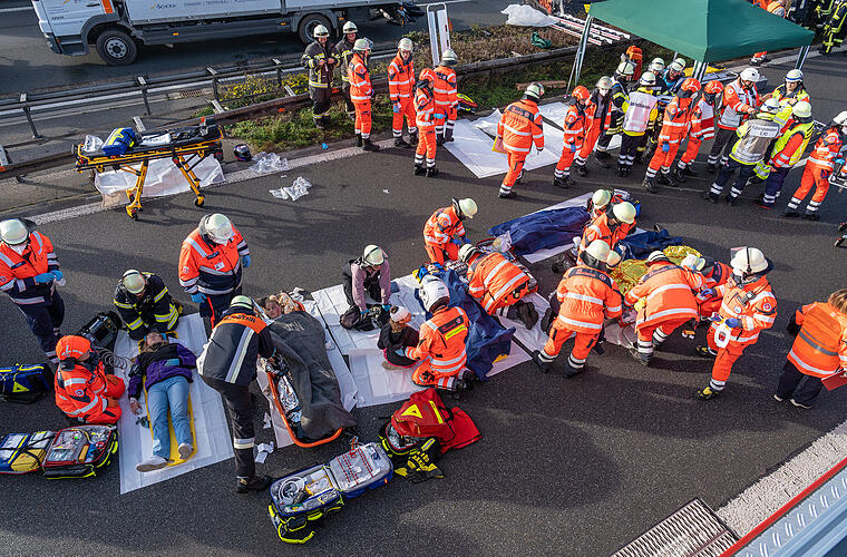 Der Rettungsdienst habe "Verletztendarsteller geschminkt, die auch realitätsgetreu in den Fahrzeugen saßen, am Boden lagen, gestellte Zeugen und Unfallbeteiligte, die quasi schreiend durch die Gegend liefen", erzählte Weber. "Rettungsdienst und Feuerwehr mussten alle Patienten sichten, priorisieren und in enger Zusammenarbeit die Personenbefreiung durchführen."