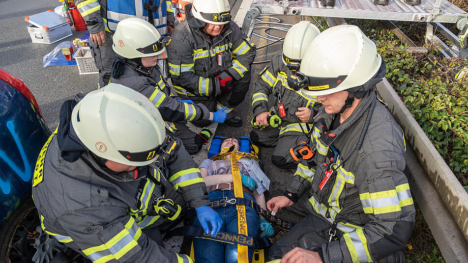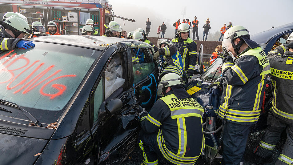 Großübung auf der A3 bei Schlüsselfeld: Unfallszenario mit ineinander verkeilten Fahrzeugen