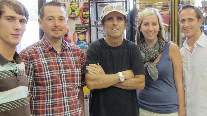 Erst auf den zweiten Blick erkannten Mitarbeiter den Kunden, der sich am Donnerstag bei Hinz - Mode & Freizeit am Bamberger Maxplatz für das Messersortiment interessierte: Der englisch sprechende Mann war kein geringerer als Alice Cooper. Als er am Freitag nochmals kam, um eine Stoffschere zu kaufen, die er laut Matthias Hinz "zum Zerschneiden von T-Shirts" benötigte, stimmte der Rockstar einem Erinnerungsfoto mit der Belegschaft sofort zu. Keinerlei Allüren habe der Sänger an den Tag gelegt und auch noch einem jungen Mann den Fotowunsch erfüllt, berichtete Hinz: "Er war ein sehr angenehmer Kunde."