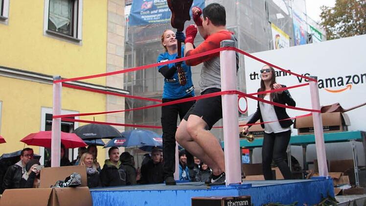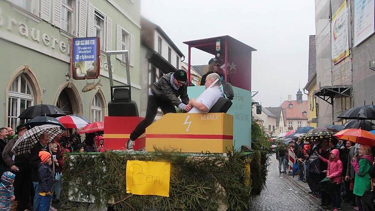 Unter dem Motto "Kampf der Titanen" zeigten sich die Kerwasburschen und -madla stolz über den Erfolg eines ortsansässigen Unternehmens: "Europas größtes Musikhaus knockt Amazon ganz leicht aus," und wurde als bester Onlineshop ausgezeichnet. "Angeschoben" wurde eine konventionelle Radfahrerin von ihren drei E-Bike-Begleitern, denen die gemeinsame Radtour zu langsam ging.