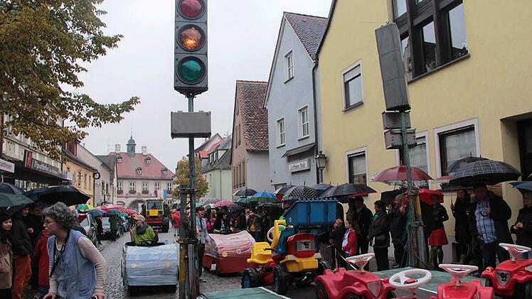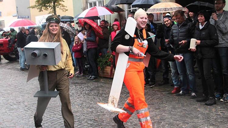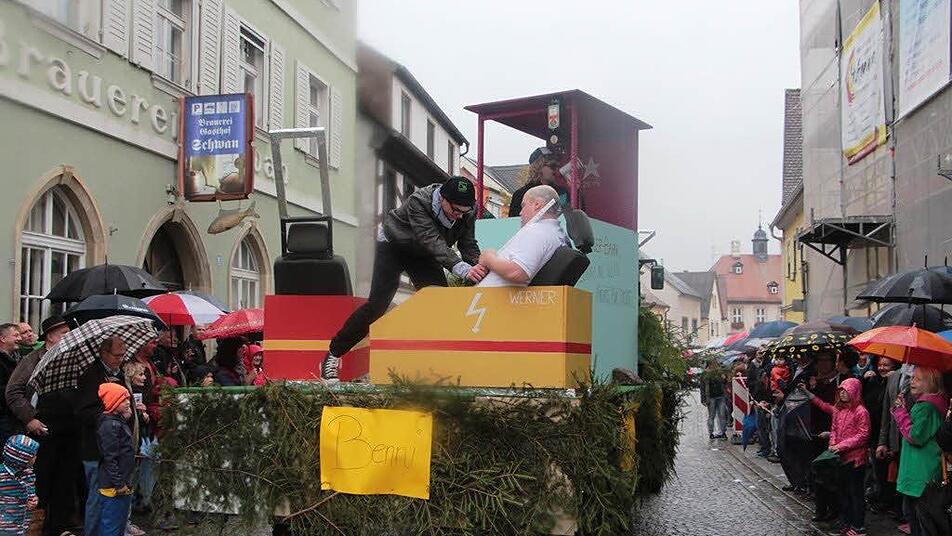 Viele Zuschauer säumten am Sonntagnachmittag die Straßen von der Grasmannsdorfer Straße bis in den historischen Ortskern und warteten trotz Regens wieder gespannt auf die Wagen und Fußgruppen der Kerwasburschen und -madla zum Kirchweihumzug in Burgebrach.