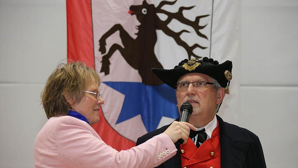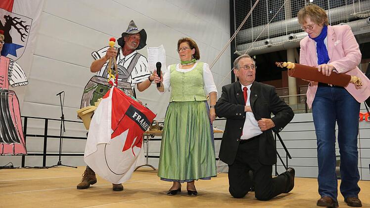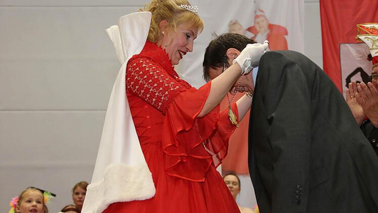 Für die Frankenlagune gab's Gutscheine für ihn und seine Frau Christine. Die staunte nicht schlecht, als ihr Andi plötzlich ein Krönchen aufgesetzt bekam - und nicht nur der: Das Faschings-Prinzenpaar krönte das Bürgermeisterpaar Romana Gensel (WGR, Zweite Bürgermeisterin) und Andreas Schlund. Der strahlte übers ganze Gesicht, als er mit wippender roter Schärpe über die Bühne stolzieren durfte.