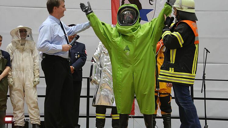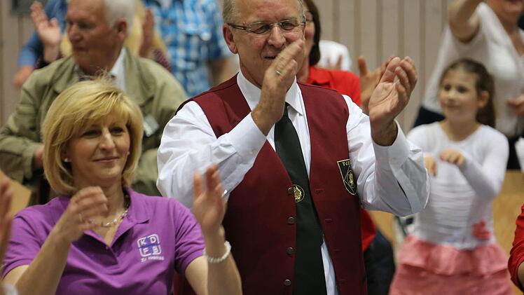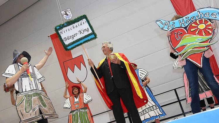 Einige Programmpunkte später musste er schon wieder rauf aufs Podest in der Regnitzarena - und plötzlich "auf die Knie!", wie ihn Moderatorin Anette Schreiber aufforderte. Weil er brav gehorchte, wurde er königlich belohnt: Für seine "Verdienste zum Wohle der Bürger Hirschaids" krönten ihn die "Seigendorfer Bergleute", eine Musiker-Truppe, zum "Bürger King".