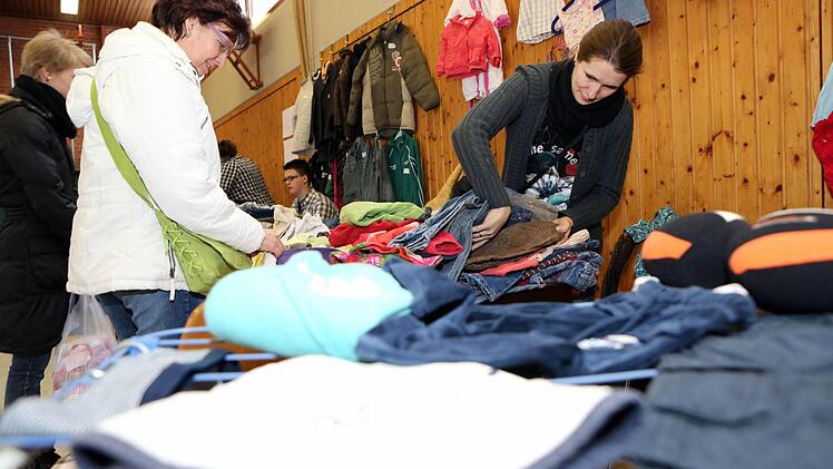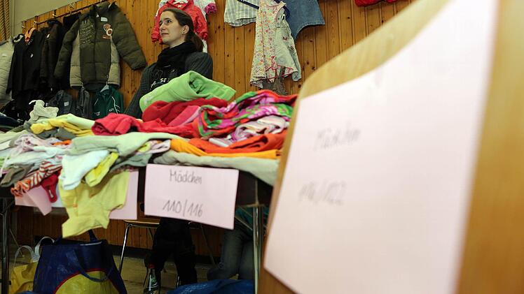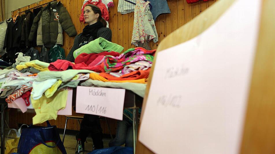 "Was kostet das?", fragt eine Frau und hält drei Teile hoch. "Zwei Euro für das T-Shirt, zwei für die Tunika, drei für das Cordkleidchen." Die Kleinkind-Klamotten von der Tochter gehen heute besser als die vom Sohn.