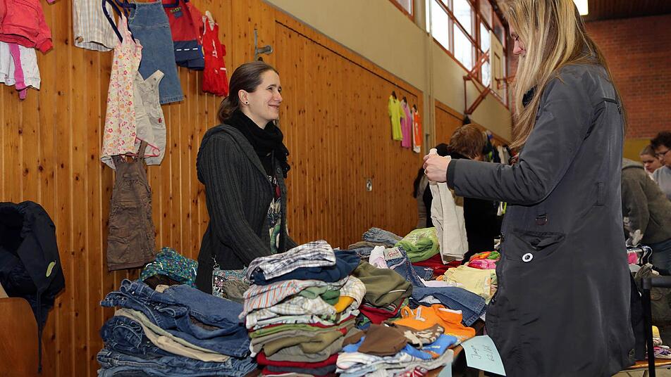 In den Hallen hagelt es Zahlen. 50 - 110 - 116. "Haben Sie auch was in 104?" Die Sprache, die heute gesprochen wird, heißt Kindergrößen. Die erste Frage von Sabine Fehn ist immer die gleiche: "Hallo, welche Größe brauchen Sie denn?" Die Zapfendorferin hat einen Tischplatz ergattert und darf beim Regenbogenbasar in der Grund- und Mittelschule die Kleinkind-Klamotten ihres Nachwuchses verkaufen.