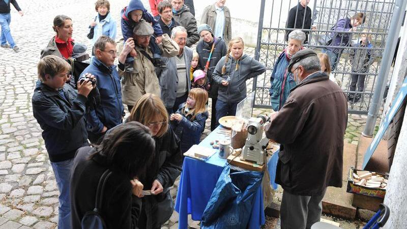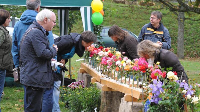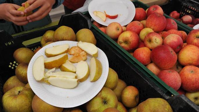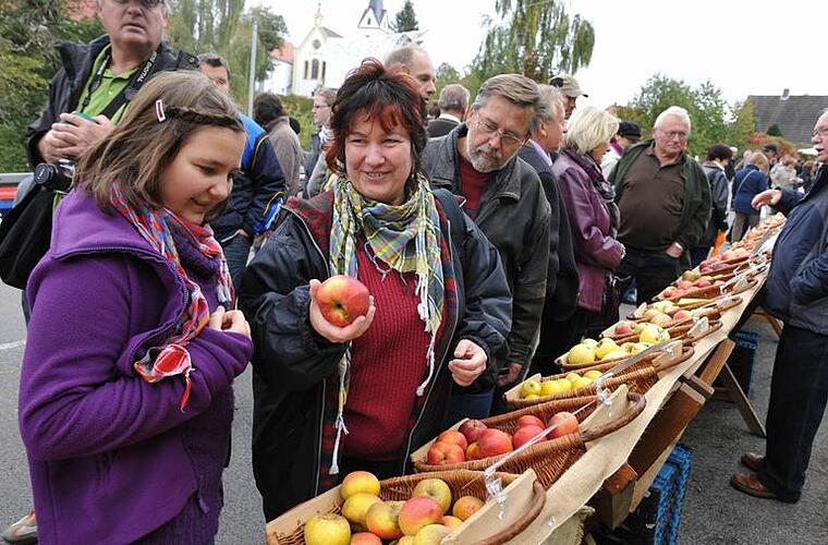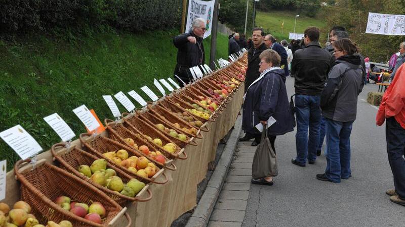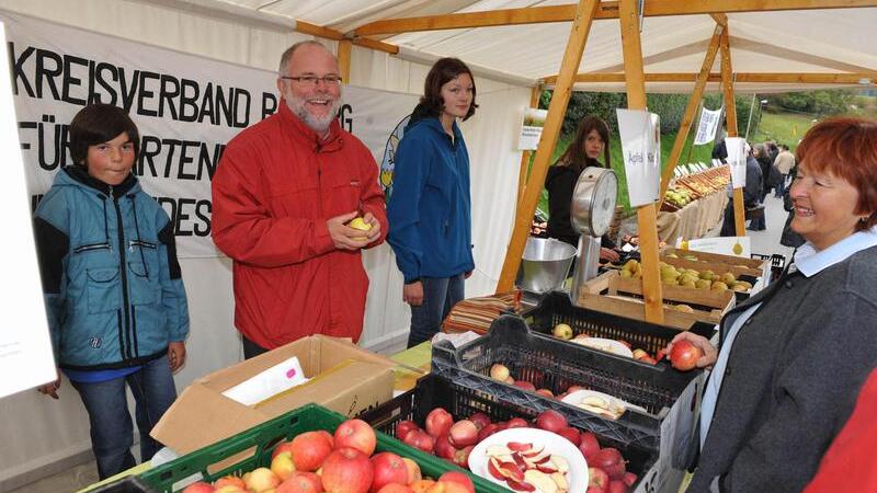 Hans Sauer vom Kreisverband ist der Herr über die ausgestellten Obstsorten. Er muss die Besucher abhalten, die Sorten zu probieren, und bitten, einen Stand weiter zu gehen. Eine undankbare Aufgabe. Kreisfachberater Uwe Hoff wiederum versucht, die von Besuchern mitgebrachten Apfelsorten zu bestimmen. Doch manchmal muss auch er passen. Christa Götz aus Baunach hat  sogar die Blätter am Apfel gelassen, denn sie möchte diese saftige Sorte unbedingt in ihrem Garten pflanzen. Zwar kann Hoff ihr nicht direkt helfen, rät jedoch, Ende Dezember ein Edelreis des Baumes in einer Baumschule veredeln zu lassen.  Nachmittags und mit der Sonne verdichten sich die Besucherströme. Hoff ist sehr zufrieden mit dem Andrang,  "Tausende", sagt er und "noch mehr wären wahrscheinlich eine Katastrophe".