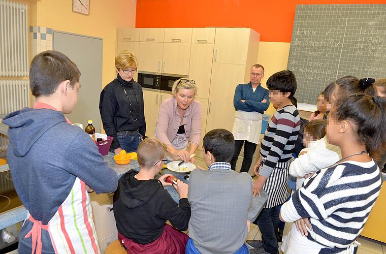 Juliette Kemmer hebt sogleich eine Birne. Gleiches Spiel nochmal. Ihre Kollegin Vally Ölschlegel zeigt den zuschauenden Kindern dann, wie man einen Apfel in kleine Schnitze schneidet, das Kernhaus entfernt. Danach wird's ernst: Die Kinder sollen sich das "Werkzeug" für den Obstsalat aus den Schubladen holen und loslegen. Förderlehrer Benno Hoch hilft dabei, gibt Anweisungen.