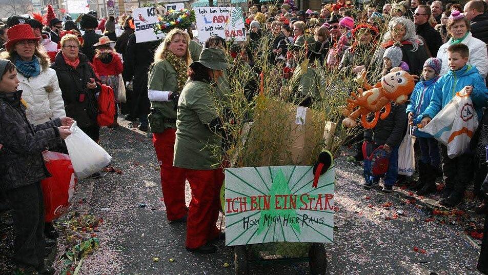 Die Sassanfahrter Kegler wollten sich für die heiß begehrten vier Bahnen im Dschungel-Camp opfern, jammerten aber sogleich: "Ich bin beim ASV - holt mich hier raus!" Jeder in der Fußgruppe trug ein T-Shirt mit seiner eigenen Telefonnummer. Schau'n mer mal, wer sie alle abräumt.