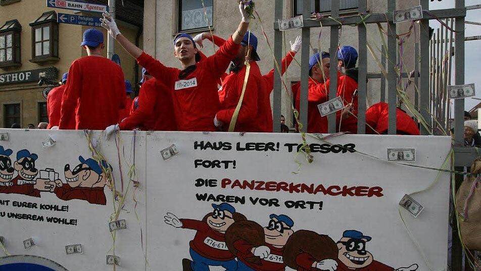 Her mit der Kohle Hinter Gitter präsentierte sich die JFG Deichselbach-Regnitzau. "Her mit eurer Kohle, nur zu unserem Wohle" bekannte sich die Jugendgruppe zu einem Spitzbubenstreich, der durch den Blätterwald rauschte: Ja wenn einem weithin bekannten gastronomischen Betrieb der Tresor abhandenkommt, dann waren wohl die Panzerknacker vor Ort.