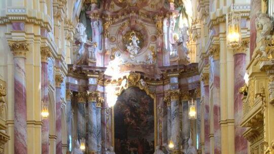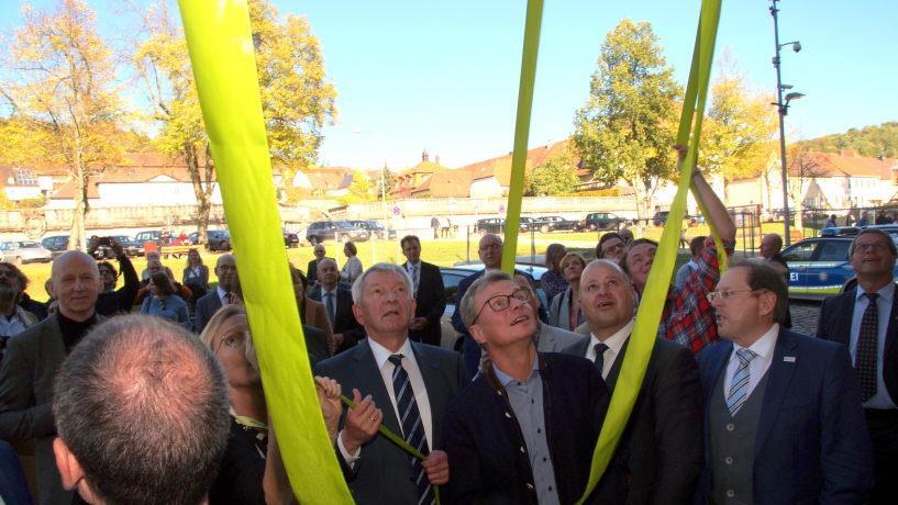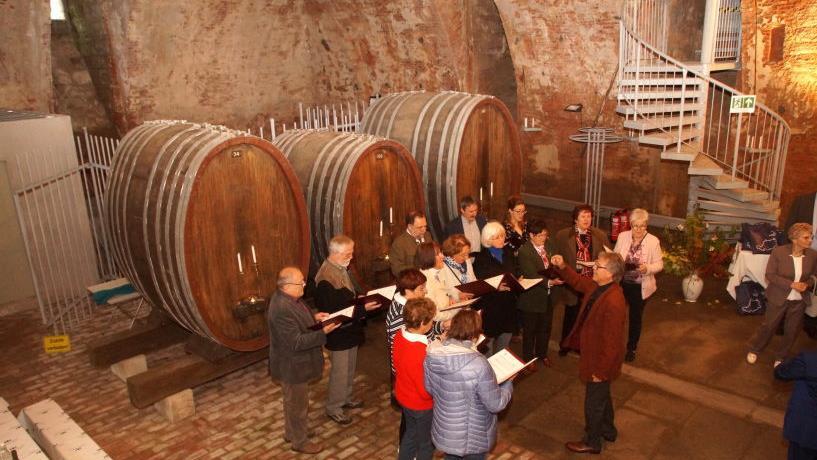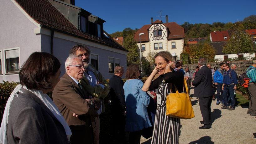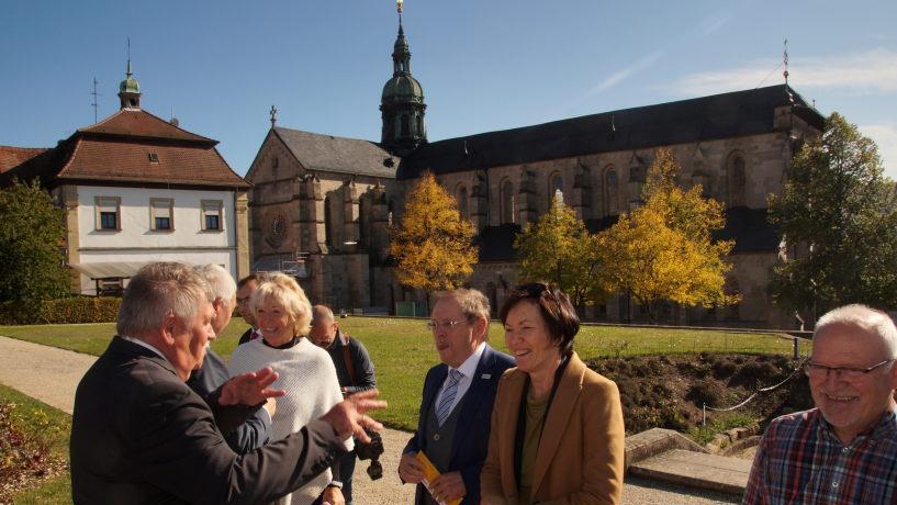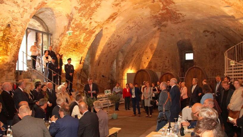 Bürgermeister Max-Dieter Schneider führte den Minister und die Politiker noch kurz in die Abtei, wo er ihnen das Zimmer des Abtes zeigte und um einen Zuschuss zu einer unerwarteten Erweiterung bei der Renovierung bat. Natürlich durfte ein kurzer Blick in den Kaisersaal nicht fehlen. Dann trafen sich alle im Abt Degen-Keller zum Empfang, Umtrunk und Eintrag in das Gästebuch des Marktes Ebrach. Der Chor umrahmte auch diesen Teil wieder musikalisch.