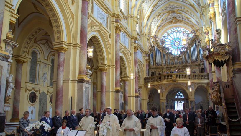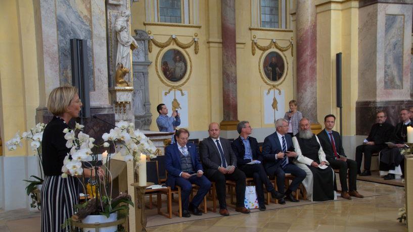 Die Festandacht hielten die beiden Zisterziensermönche und Domkapitular Norbert Jung. Er sprach im Namen der Erzdiözese, die ja auch Partner sei, aber auch als Ordensreferent. Er freue sich, dass wenigstens für kurze Zeit zisterziensisches Leben hierher zurück gekehrt sei. Abt Philipp zitierte in Latein aus der Benediktsregel und sagte, dass die Zisterzienser schon eine gemeinsame europäische Sprache hatten, die ein guter Teil beherrschte. Auch habe Euro durch die Zisterzienser zusammengefunden. Nach der Festandacht konnten die Besucher noch die Ausstellung in der Kirche besichtigen.
