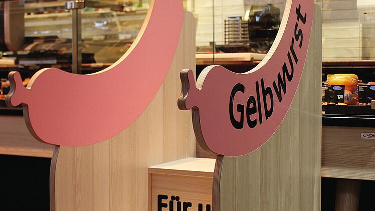 Im Rewe-Markt in Hallstadt steht vor der Theke eine "Gelbwursttreppe",