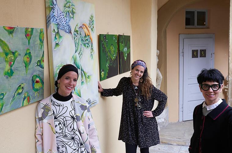 "Es werden Malereien, Zeichnungen und Fotografien zu sehen sein", sagt Katharina Hückstädt. Sie und Annabel Adler machen als "Kathanna" gemeinsam Aktionskunst und verewigen in ihren Werken gerne intime Blicke auf Schönheiten der Natur wie Tiere, Pflanzen oder Augen. Zu Barbara Bollerhoffs Sujets gehören unter anderem die Unendlichkeit und Aktzeichnungen. Sie hat auch jahrelang als Bühnenbildnerin für das Theater Chapeau Claque gearbeitet.