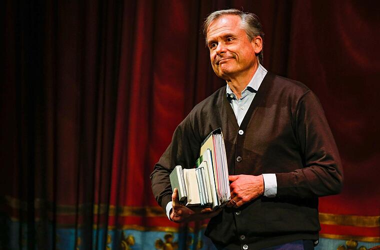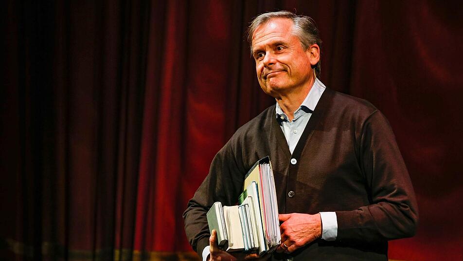 Schnickschnack gehört nicht zum Repertoire Axel Hackes. Ruhig und gelassen schlendert er auf die Bühne des Bamberger E.T.A. Hoffmann-Theaters, unter dem Arm nichts weniger als große Teile seines Lebenswerkes haltend. Dieses, also sein Lebenswerk, ist thematisch tief besetzt. Es reicht von Anekdoten des Kindergartenpapas bis hin zu Erzählungen über niederträchtige alte Männer, die zufällig große Nationen regieren. Der gebürtige Braunschweiger, der zehn Jahre jünger wirkt als es sein Geburtsjahr 1956 vermuten lässt, traut sich an diesem Abend einen Spagat. Er mischt leichte humorige Kost mit tiefgreifenden Grübeleien über Moral und Anstand. Das ist heikel. Aber es funktioniert.