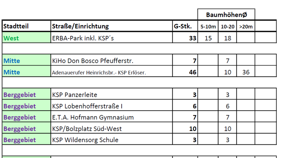 Die Standorte der Eichen können den beigefügten Tabellen (Stand April 2023) entnommen werden.