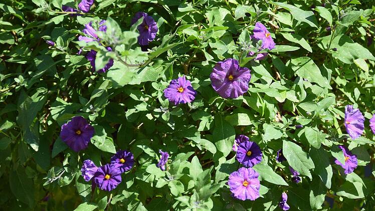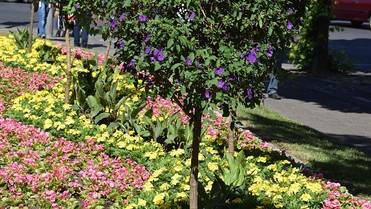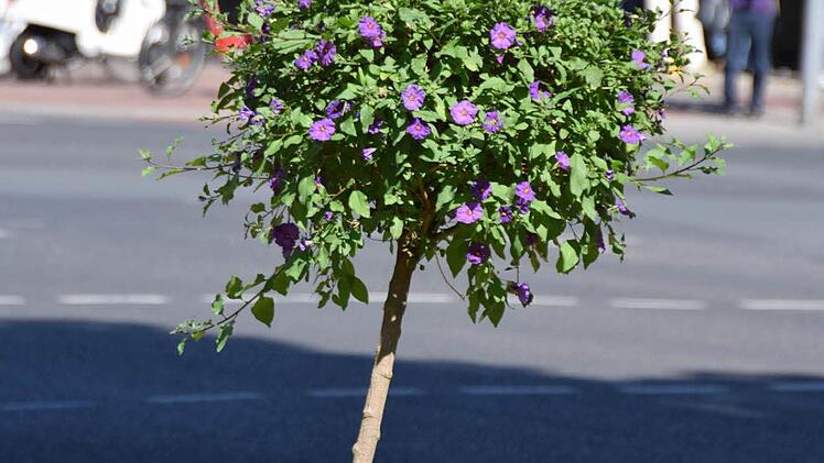 Mediterranes ist beliebt Kein Wunder also, wenn Bambergs Gärtner bei dieser Witterung auch gerne zu mediterranen Stauden oder Blumen greifen. Solanum - oder auch Enzianbäumchen genannt - ist eines dieser Gehölze. Am Schönleinsplatz haben Björn Schlaug und sein Kollege Matthias Hennemann viele dieser Bäumchen mit lila Blüten gesetzt. "Sie vertragen keine große Kälte, daher überwintern wir sie in Hallen oder Gewächshäusern", so Schlaug.