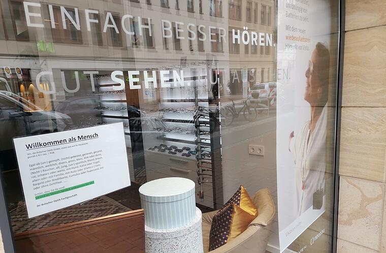 Bamberger Optiker wendet sich mit Schaufenster-Botschaft an Kunden: Die Corona-Pandemie hat insbesondere den Einzelhandel vor viele Probleme gestellt. Die ständig wechselnden Regeln bereiten den Geschäftsleuten vielerorts Kopfzerbrechen. In der Bamberger Innenstadt sorgt derweil ein Schaufenster-Aushang aktuell für neugierige Blicke. Mit einer nicht alltäglichen Botschaft wendet sich das Fachgeschäft Butscher Optik darin an Passanten und Öffentlichkeit. Unter der Überschrift "Willkommen als Mensch" verweist das Optikergeschäft in der Langen Straße auf den Gebrauch seines Hausrechts.