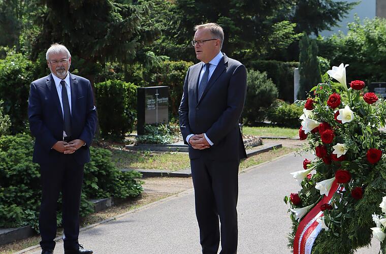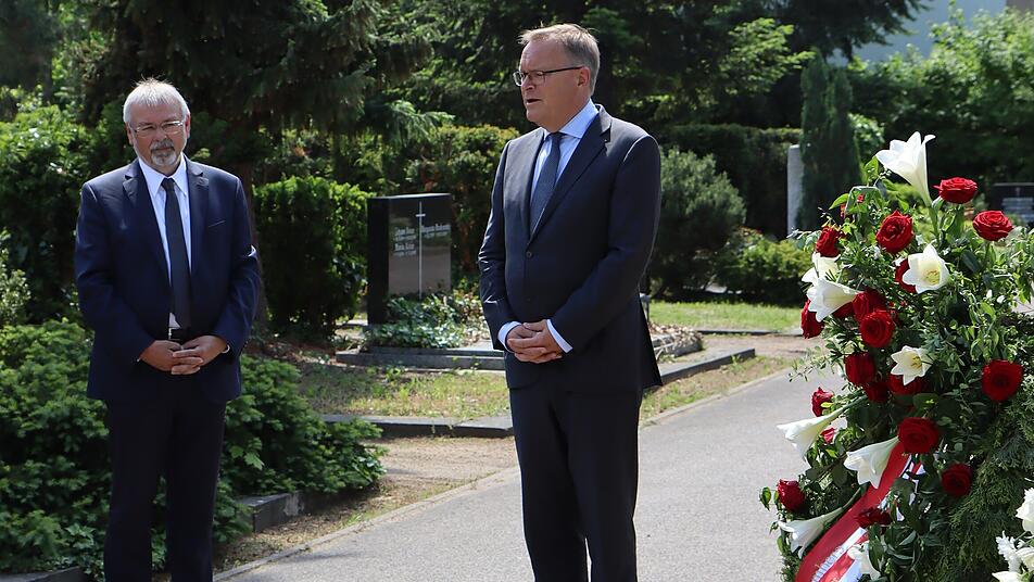 Anlässlich des 75. Todestags von Geheimrat Dr. Lorenz Krapp legten der Präsident des Oberlandesgerichts Bamberg Lothar Schmitt und der Oberbürgermeister der Stadt Bamberg Andreas Starke (SPD) gemeinsam Kränze am Grab von Geheimrat Dr. Krapp im Hauptfriedhof nieder.