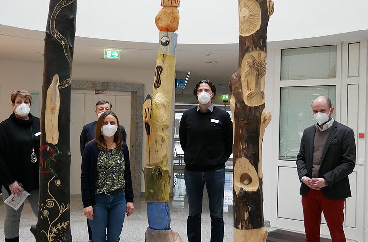 Als eine Art „Gesundheitsmobile“ stellt es, frei hängend, die Verbindung zwischen den Holzobjekten und dem ersten Stock dar. Das Ergebnis ist beeindruckend und das Feedback der Mitarbeiter*innen auch. Trotz der angespannten Arbeitssituation, waren die Mitarbeiterinnen und Mitarbeiter begeistert dieser Frage nachzugehen, sich mit Kolleginnen und Kollegen auszutauschen und kreativ und mit handwerklichem Geschick gestalterisch umzusetzen.