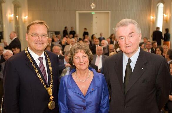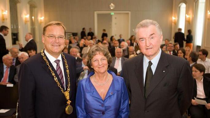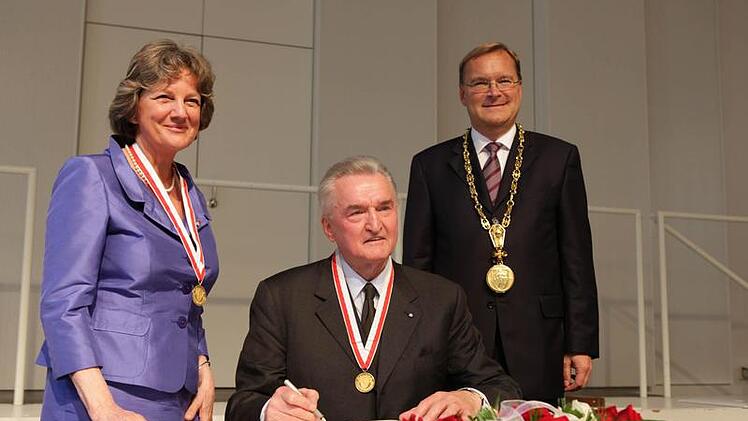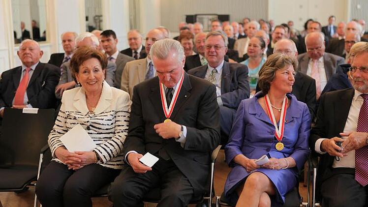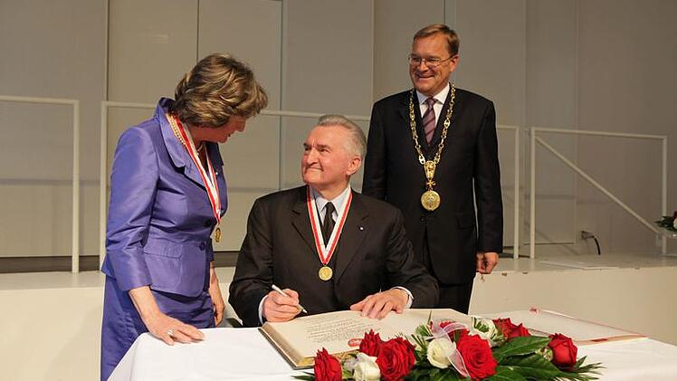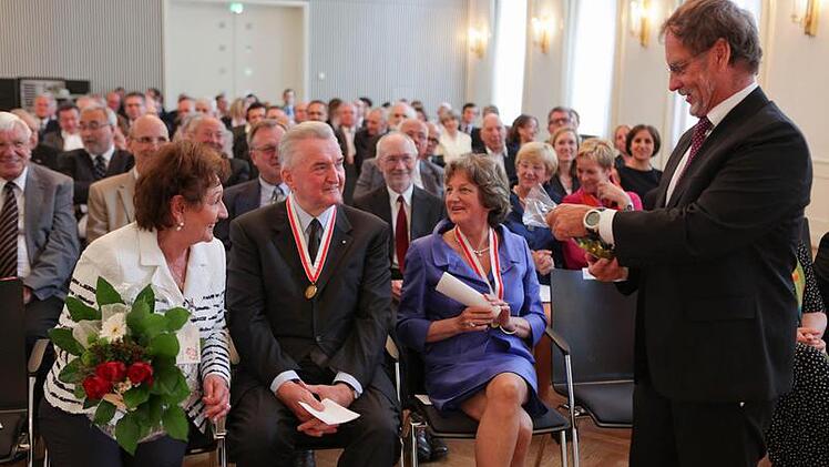 "Das Wohl der Stadt eindrucksvoll und dauerhaft gefördert" haben zwei Persönlichkeiten, die heute in Bamberg in den kleinen Kreis der Bürgermedaillen-Träger aufgenommen wurden. Oberbürgermeister Andreas Starke (SPD) verlieh die Goldmünze am Band an Karin Dengler-Schreiber und an Helmuth Jungbauer. Den Rahmen bildete eine Festsitzung des Stadtrats im Spiegelsaal der Harmonie und Musik eines Trios, das aus Lehrkräften der städtischen Musikschule bestand.