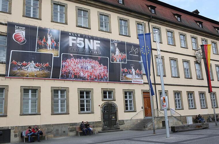 Die "F5nf" auf dem Banner steht übrigens für die fünfte Meisterschaft in Folge, die die Bamberger Basketballer natürlich gerne nach Hause holen wollen. Ob dies der Fall sein wird, steht spätestens am 22. Juni fest, dem Tag eines möglichen fünften Finalspiels.