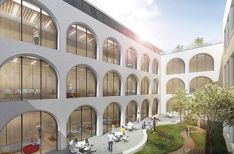Der Innenhof soll den Plänen des Erzbistums zufolge durch eine große Glasdachkonstruktion zu einer großen Aula werden. Ein "integrales Konzept der Höfe" soll die Einzelgebäude von Realschule, Gymnasium und der Ganztagsschule verbinden. Außerdem sind große Fenster geplant, die "Ein- und Ausblicke erlauben".
