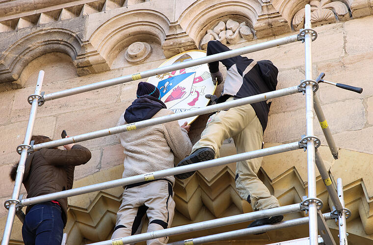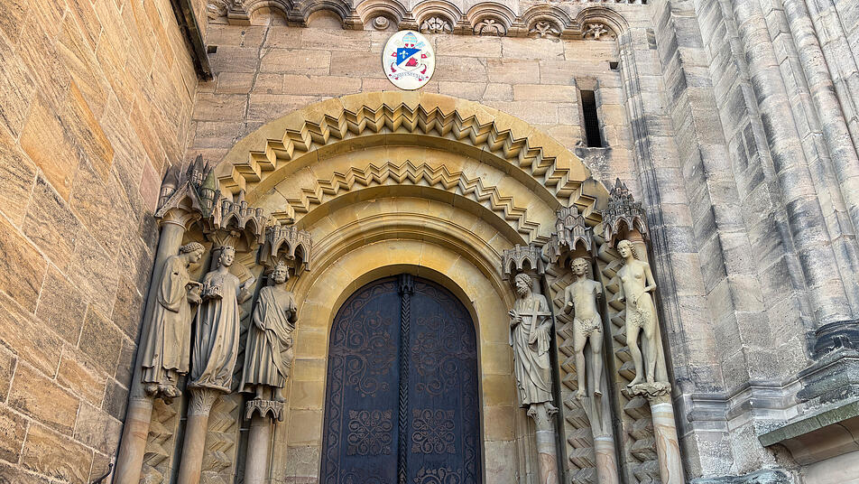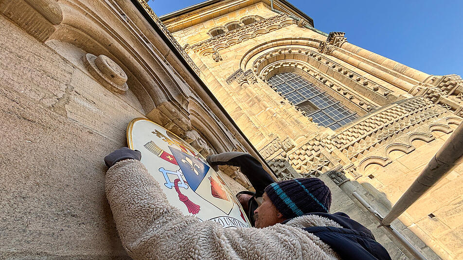 Das neue Papstwappen von Papst Leo XIV. wurde am Bamberger Dom angebracht. Mitarbeiter der Dombauhütte montierten das Papstwappen oberhalb des Adamsportals.