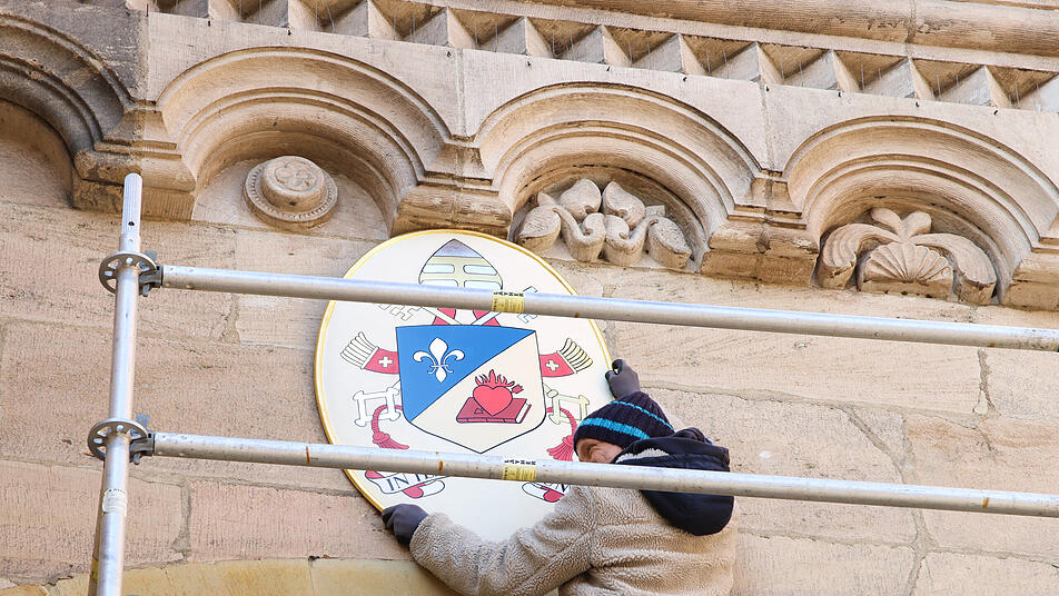 Das neue Papstwappen ist jetzt auch am Bamberger Dom zu sehen. Drei Mitarbeiter der Dombauhütte befestigten das handgemalte Wappen oberhalb des Adamsportals, wie aus einer Mitteilung hervorgeht. Damit hängt es an der gleichen Stelle, an der bis vor Kurzem das Wappen von Papst Franziskus zu sehen war.