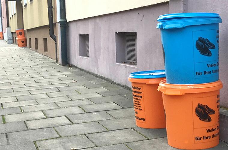 Altkleidersammlung in Bamberg: Vor zahlreichen Wohnhäusern in Bamberg prägen aktuell blaue und orangefarbene Eimer das Straßenbild. Die auf den Gehsteigen deponierten Sammelbehälter dienen laut Beschriftung einer "großen Schuh- und Altkleidersammlung". Bürgerinnen und Bürger können demnach Schuhe, Altkleider, tragbare Textilien, Federbetten, Bettwäsche, Decken und Handtaschen in die dafür aufgestellten Eimer geben - als "Spende".