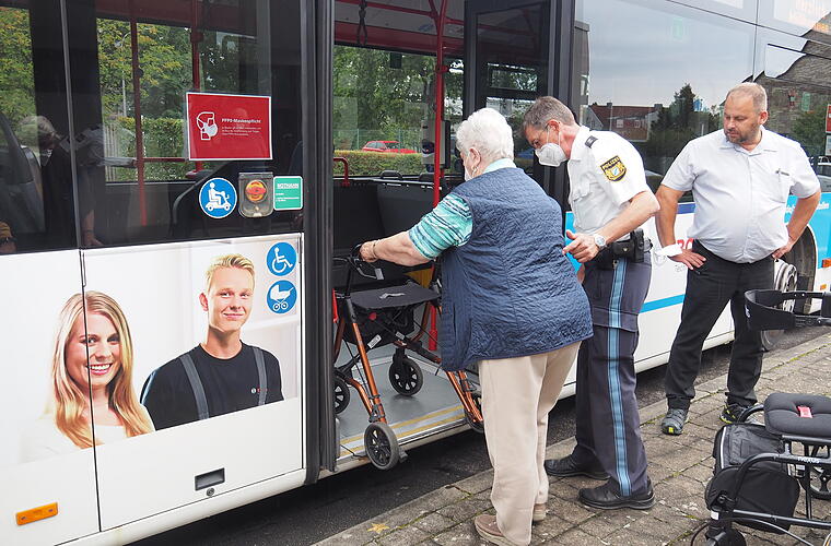 Natürlich wird beim Kurs „Sicher unterwegs mit Gehhilfe, Rollator und zu Fuß“ nicht in erster Linie zugeschaut, sondern geübt. Gemeinsam mit seinem Kollegen Klaus Fuß erklärt Verkehrserzieher Franz Werner stets, was beim Busfahren mit Rollator zu beachten ist. „Niemals mit dem Rollator voraus aussteigen! Da besteht die Gefahr, vorne über zu stürzen.“ Stattdessen: Rückwärts aussteigen, vorwärts einsteigen. Wie das genau geht, darf jeder selbst üben.