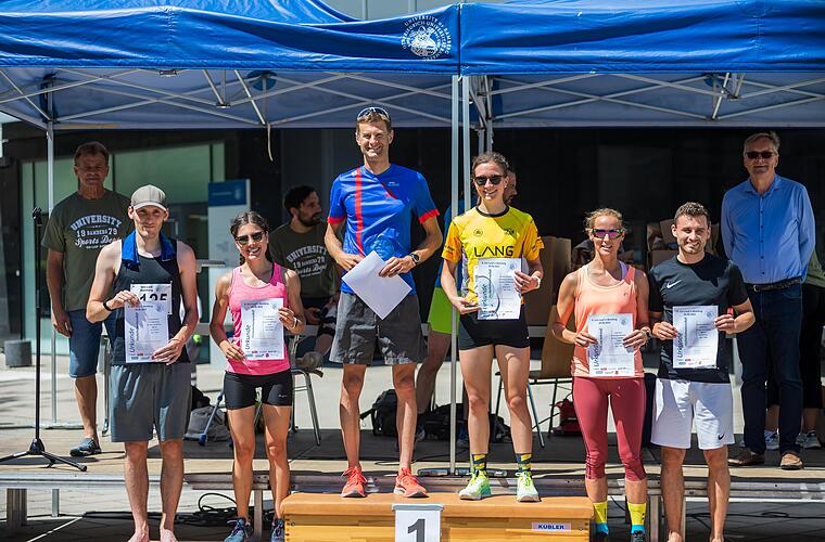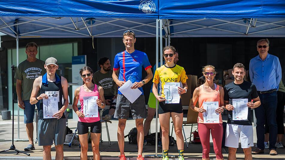 Neuer Bayerischer Hochschulmeister und Gesamtsieger des Uni-Laufs wurde Marco Sahm, Professor an der Universität Bamberg (Mitte). Gemeinsam mit den weiteren Sieger*innen wurde er geehrt.
