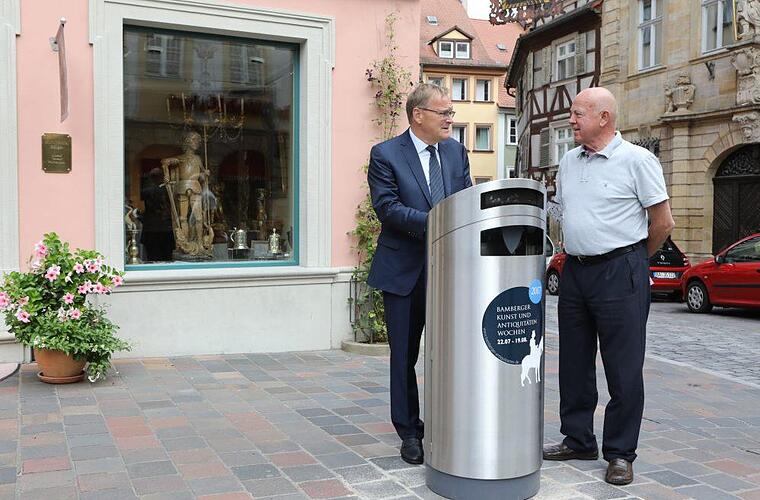 Für Kunsthändler Walter Senger ist der neue Mülleimer schon ein "Kunstwerk". Doch ausgerechnet vor seinem edlen Antiquitätengeschäft in der Karolinenstraße sei dieses Objekt wohl "deplatziert", meinte er vorsichtig.