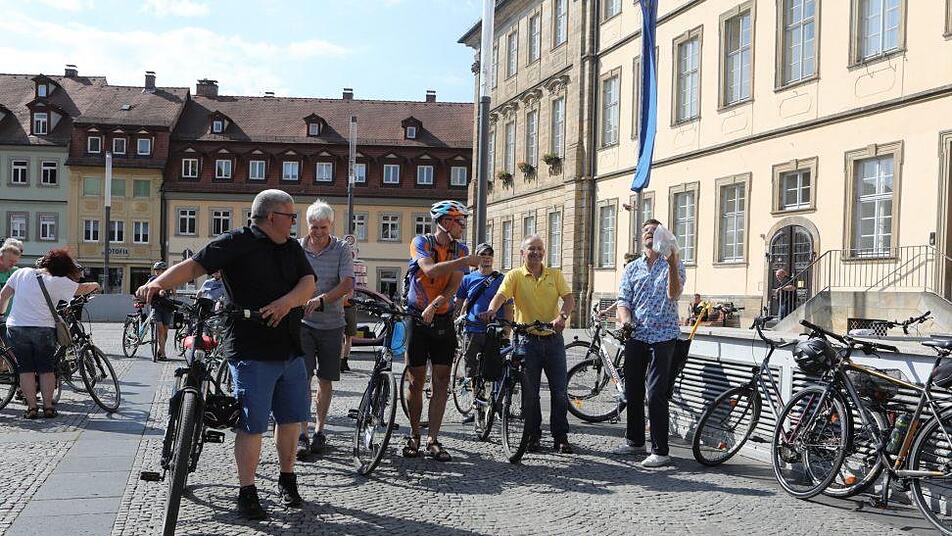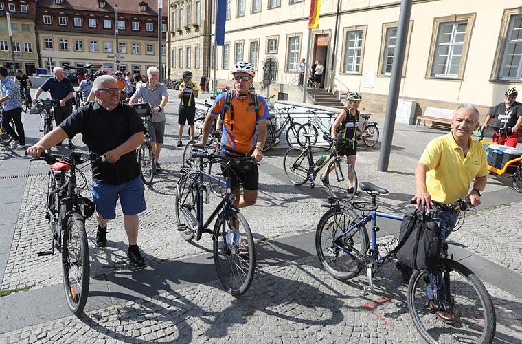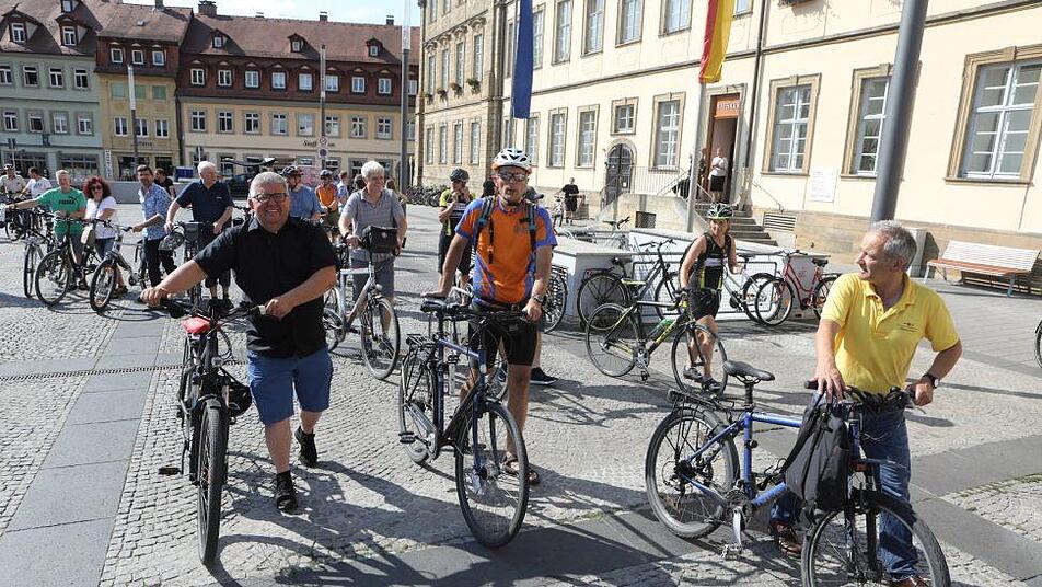 Eine brütende Hitze lag über dem Maxplatz, als sich etwa 40 Radfahrer vor dem Eingang zum Rathaus einfanden. Anlass war die in Bamberg seit Montag laufende Kampagne "Stadtradeln" des Klima-Bündnisses der europäischen Städte, an der sich die Stadt zum fünften und der Landkreis heuer zum dritten Mal beteiligen. Landrat Johann Kalb (CSU) wünschte den Radlern beim offiziellen Startschuss einen "guten Start beim Stadtradeln 2018."