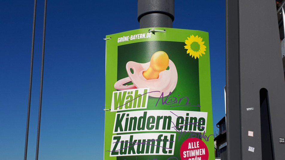 Auch die Grünen haben nicht nur zerrissene Plakate zu verbuchen. Gegenüber von Eva Jutzler auf der Kettenbrücke sah inFranken.de am Donnerstag (7. September 2023) ein Plakat mit dem diesjährigen Slogan "Wähl Kindern eine Zukunft". Hier sind Wörter durchgestrichen, stattdessen ist "nein, Mörder, scheiß Grüne und AfD" zu lesen.