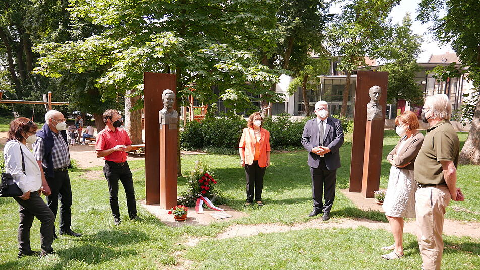 Das Mahnmal stellt in Form von Büsten drei Persönlichkeiten vor, die aus unterschiedlichen Beweggründen den Weg des Widerstands gegangen sind und mit Bamberg verbunden waren. Der adelige Wehrmachtsoffizier Claus Graf Schenk von Stauffenberg rang sich am 20. Juli 1944 zum Attentat auf Hitler durch und wurde noch in der Nacht desselben Tages erschossen.