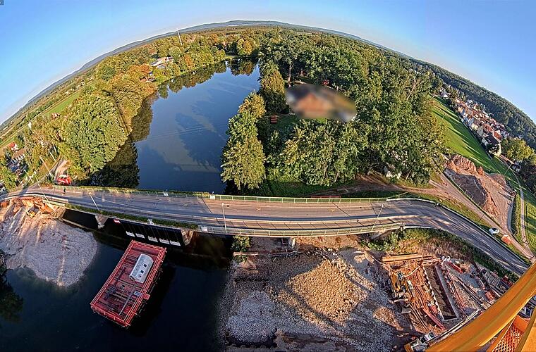 Mit dem Kranaufbau und dem Beginn der Gründungsarbeiten für den Flusspfeiler mittels eines Großbohrgerätes ist das Projekt in diesen Tagen gewissermaßen in die heiße Phase des eigentlichen Brückenbaus eingetreten. Daher ist der Blick auf das Baustellengeschehen im Herbst besonders interessant.