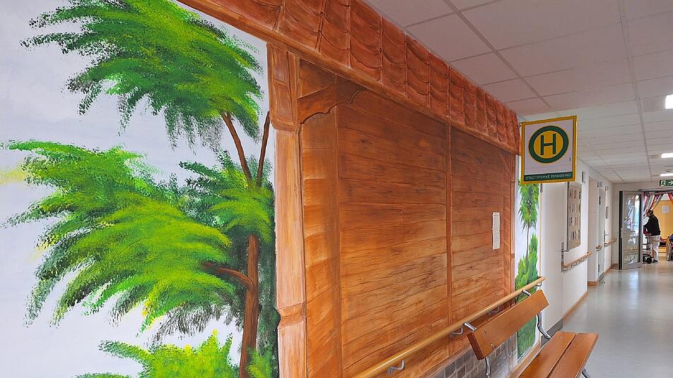 "Das Ganze habe ich damals persönlich initiiert", berichtet Schuhmann, die schon seit 1986 als Pflegefachkraft arbeitet. Vor acht Jahren wandte sie sich schließlich an die Bamberger Stadtwerke. Dort habe man das Anliegen gern unterstützt. "Die Mitarbeiter waren sehr kooperativ und haben gleich gesagt, wir sollen vorbeikommen. Die Stadtwerke haben uns dann das Bushaltestellenschild geschenkt." Im Anschluss daran wurde eigens ein Airbrusher engagiert. Mit einer speziellen Maltechnik zauberte der Designer das Motiv eines Haltestellenhäuschens samt angrenzender Bäume an die Flurwand der Pflegeeinrichtung.