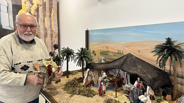 In der Tourist Information Bamberg präsentiert Krippenbaumeister Karl-Heinz Exner eine liebevoll gestaltete Krippenszene mit rund 20 handgefertigten Figuren.