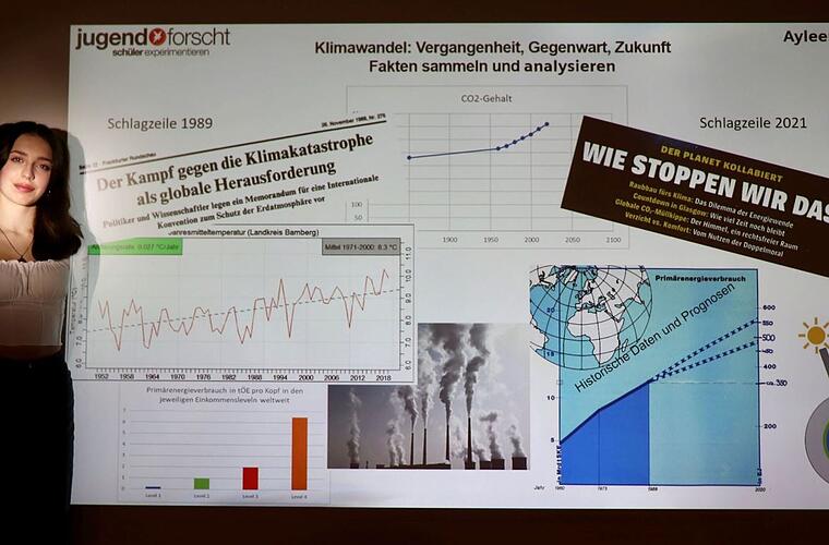 Das erste Gold (1. Platz) ging laut FLG an die 14-jährige Ayleen Zebunke, 8. Klasse, Franz-Ludwig-Gymnasium Bamberg, mit ihrem Projekt "Klimawandel: Vergangenheit, Gegenwart, Zukunft – Fakten sammeln und analysieren".