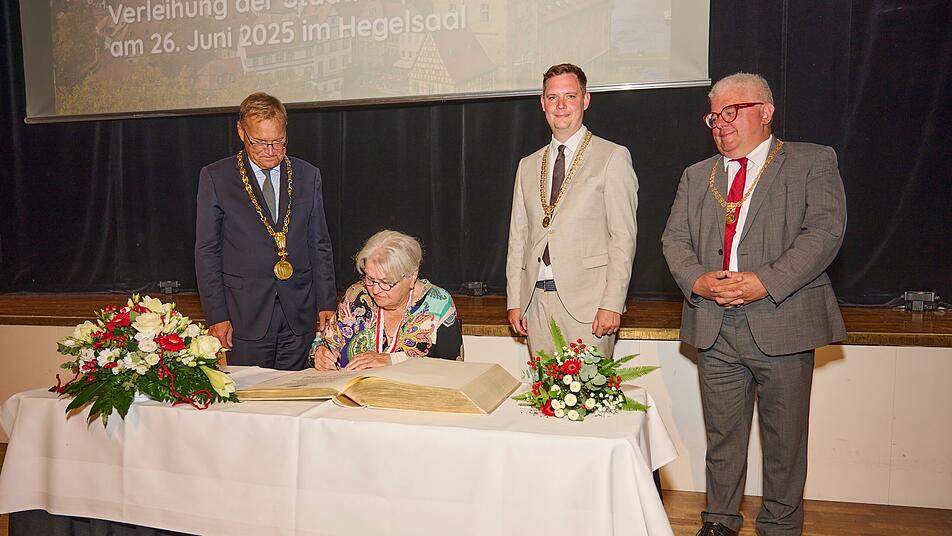 Bambergs Oberbürgermeister Andreas Starke, Zweiter Bürgermeister und Sozialreferent Jonas Glüsenkamp sowie Dritter Bürgermeister Wolfgang Metzner dankten den acht neuen Trägerinnen und Trägern der Stadtmedaille von Herzen und überreichten feierlich die Auszeichnung. Die Geehrten trugen sich außerdem ins Goldene Buch der Stadt Bamberg ein.