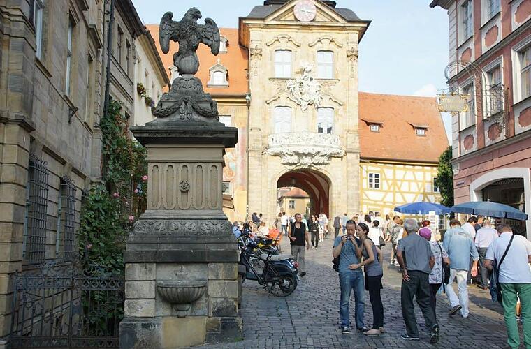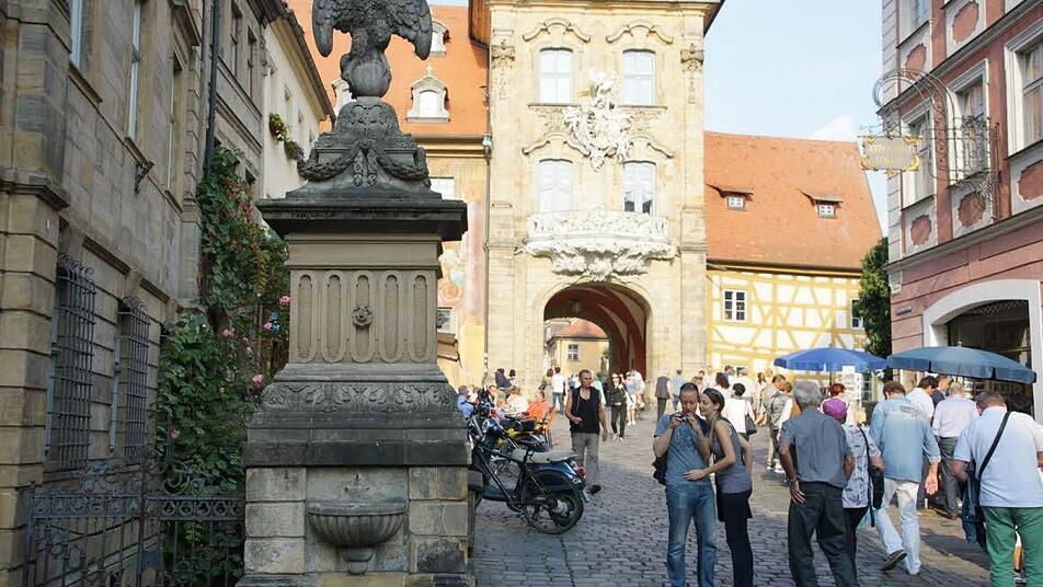den Krallen hält. So fährt die Stadtführerin mit der Straßenbahn, die in Bamberg zu Beginn des 20. Jahrhunderts verkehrte, zum Düthorn-Brunnen mit dem Adler. "Einmal ist dieses Tier der Lüfte tatsächlich aufgeflogen, aber nicht in die himmlische Sphäre. Es hat sich 1881 von seiner Kugel gestürzt", erfahren Leser. Bildhauer Lorenz Kamm schuf den "Pechvogel" neu, der sich 1901 auf die Altenburg absetzte und von dort weiter Richtung Bürgerspital zog. Sodass Hans Leitherer 1928 ein weiteres Exemplar fertigte, das fortan auf der Erdkugel des Düthorn-Brunnens - jederzeit bereit zum Abflug - thronte.