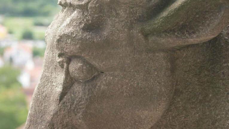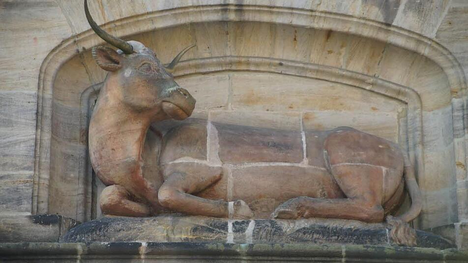 Was der philosophierende Vierbeiner wohl zu dem tätlichen Übergriff sagte, der ihn 1999 verstümmelte? Bei der letzten Sandkerwa des Jahrtausends brach ein Horn des Ochsen ab, an dem die Kabel eines Karussells zerrten. Verschollen blieb das Originalhorn, das es zu ersetzen galt. Erst anderthalb Jahre nach dem Verschwinden gab's Ersatz aus Bambergs ungarischer Partnerstadt Esztergom.